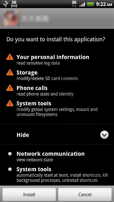 The malicious application asks for the following permissions during installation: