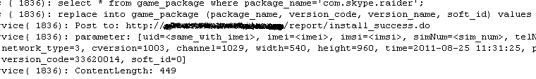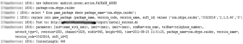 The trojan also collects package information for apps newly installed on or removed from the device. For this sample, a test install of Skype was used.