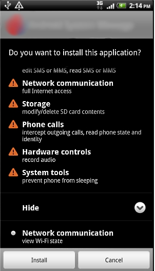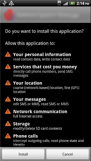 Prior to installation, Trojan:Android/Nickispy.A displays the following permission requests: