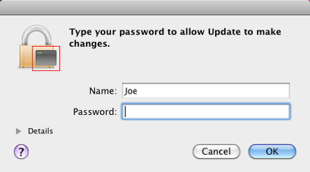 Only after downloading the payload does Flashback.K proceed with infecting the machine. To do so, the malware prompts for the administrator password, as in the following screenshot: