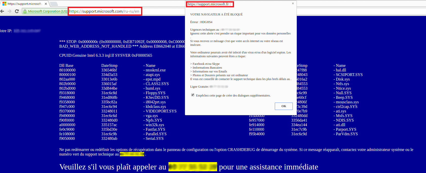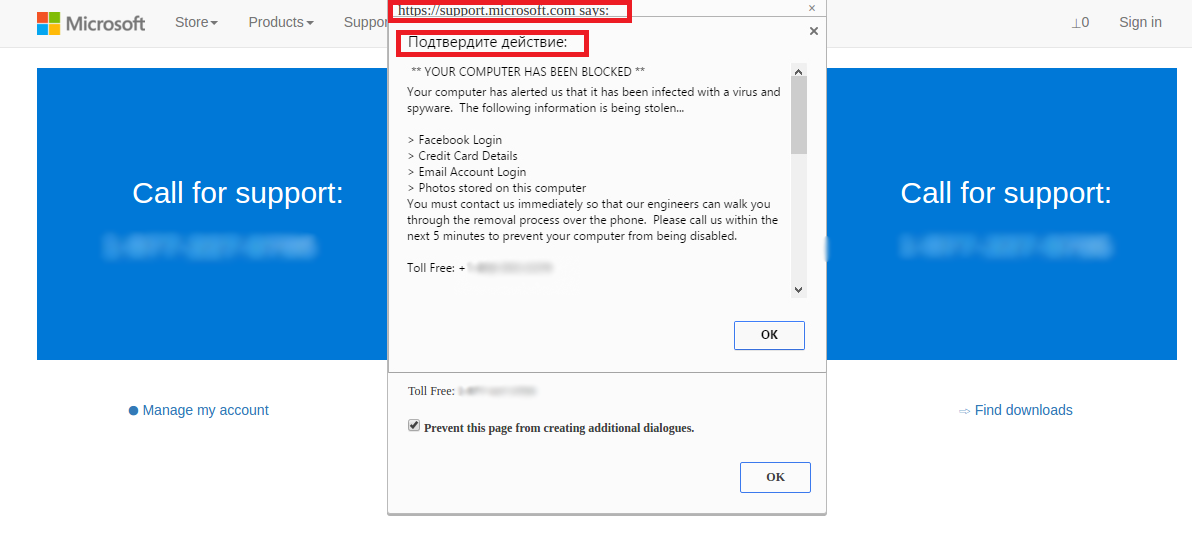 Cryxos trojans display an alarming notification message saying that the user's computer or web browser has been 'blocked' due to a virus infection, and that their personal details are 'being stolen'. The user is then directed to call a phone number for assistance in the 'removal process'. This is a version of a 'call support' scam.