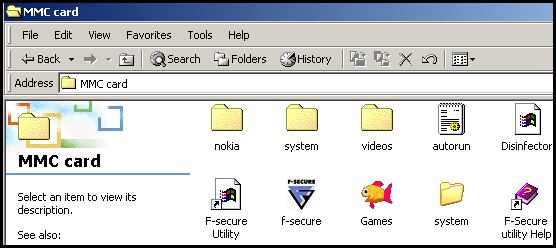 Cardtrap.M installs several Windows viruses, worms and trojans to the phone MMC card. The Windows malwares, are installed with filenames,icons and shortcut links, that try to fool user into clicking them.