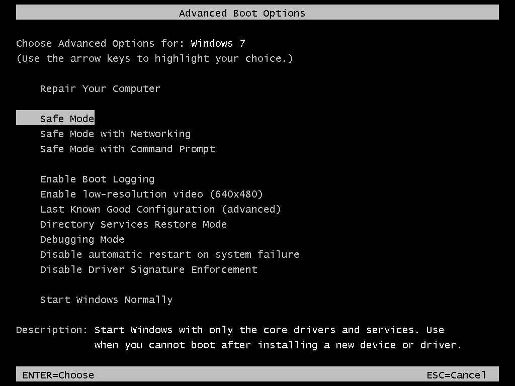 • Use the arrow keys to highlight 'Safe Mode' and then press Enter.
