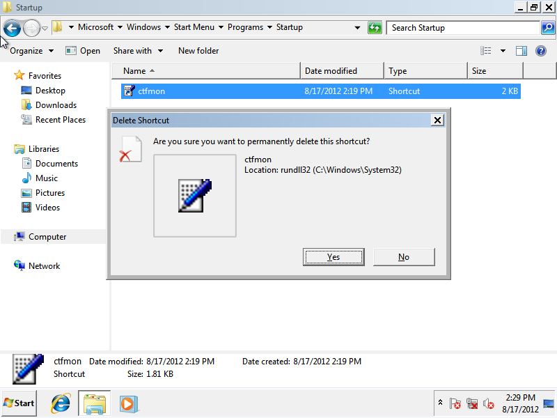 • In Safe Mode, find the file ctfmon.lnk in the Startup folder (C:\Users\Username\AppData\Roaming\Microsoft\Windows\Start Menu\Program\Startup\ctfmon.lnk) and delete it.