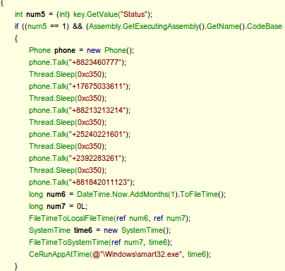 The trojan's payload involves calling six premium-rate numbers every 50 seconds, but the second variant has increased the time to 500 seconds. The numbers are: