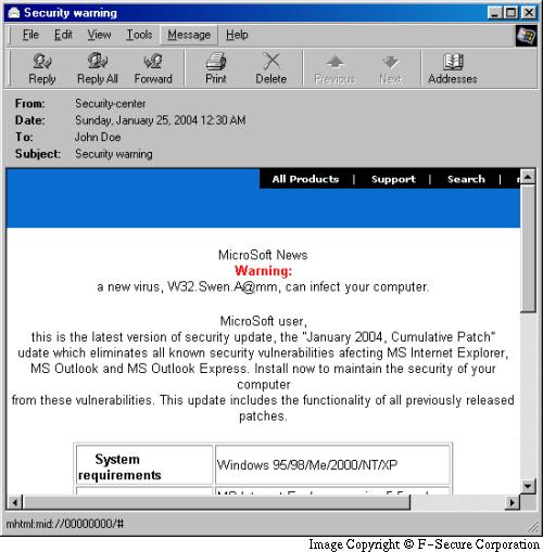On January 24th and 25th, 2004, a number of emails with a fake virus warning from Microsoft were spammed. When users view the email it attempts to download and execute a variant of VBS/Inor trojan dropper from a web site. The real address has been spoofed using a security vulnerability in Internet Explorer.