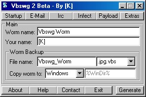 VBSWG - VBS Worms Generator - is a program that is able to produce VBS worms based on several different options.