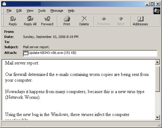 • Mail server report. Our firewall determined the emails containing worm copies are being sent from your computer. Nowadays it happens from many computers, because this is a new virus type (Network Worms). Using the new bug in the Windows, these viruses infect the computer unnoticeably. After the penetrating into the computer the virus harvests all the email addresses and sends the copies of itself to these email addresses Please install updates for worm elimination and your computer restoring. Best regards, Customers support service
