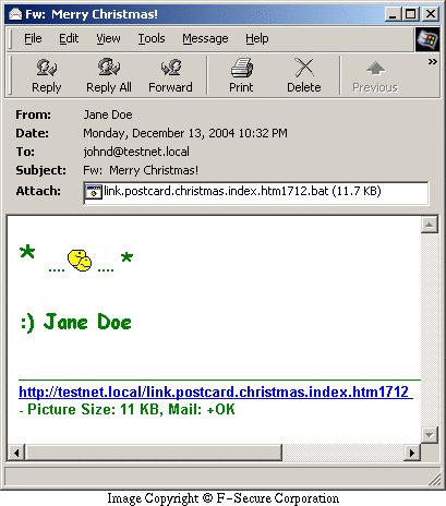 The emails contain Christmas wish messages. The attachments are files that use PIF, CMD, BAT, COM or ZIP extensions. If executed, the worm can display a decoy message in a message box saying: